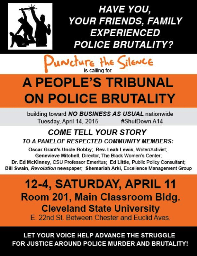 Item #3: Palm card publicizing the People’s Tribunal on Police Brutality, organized by Puncture the Silence in 2015.