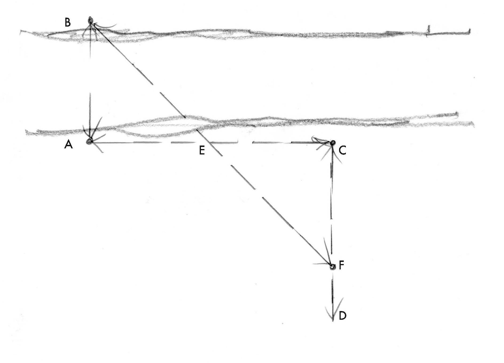 Surveyors could calculate the distance to an unknown point by using right angles to construct identical triangles in an area that could be measured (Illustration by Dan Patterson).