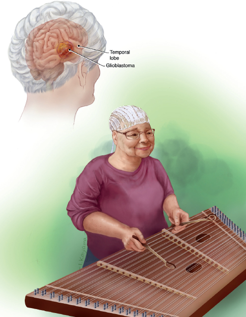 Janet had a passion for music and played the guitar, ukulele, and harp (Fig. 3.5). Before the COVID-19 pandemic, Janet would play at music festivals, parks, or nearly anywhere she could get together with her former church worship leader. Music and religion supported her through many of her difficult times. She attributed nearly all her survivorship success to religion. Janet was also very passionate about jewelry making. Yet, Janet was completely frustrated with her physical abilities, which had been impacted by GBM. She noted weakness in her left side, mainly her shoulder, arm, and leg, which caused her to be unable to play music as she once did and be independently mobile. Janet struggled with balance and was unable to watch movies with complex plots due to her confusion and memory difficulty. She was also unable to control her bladder. Janet found herself unconvinced that doctors would ever be able to diagnose her incontinence because they were highly skilled and had not yet been able to do so.