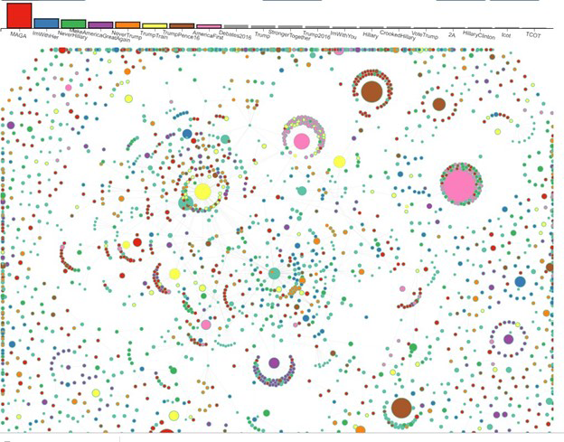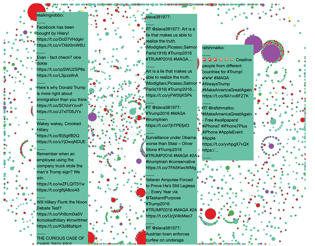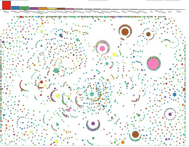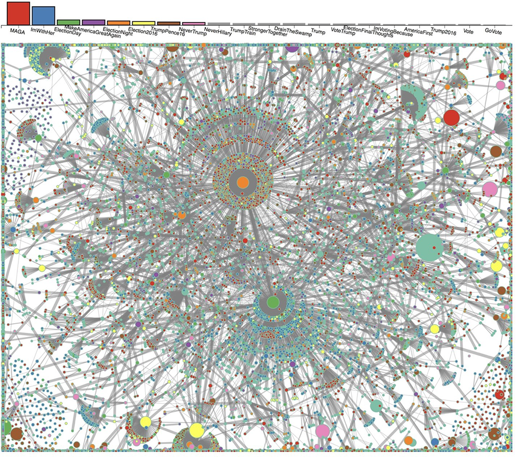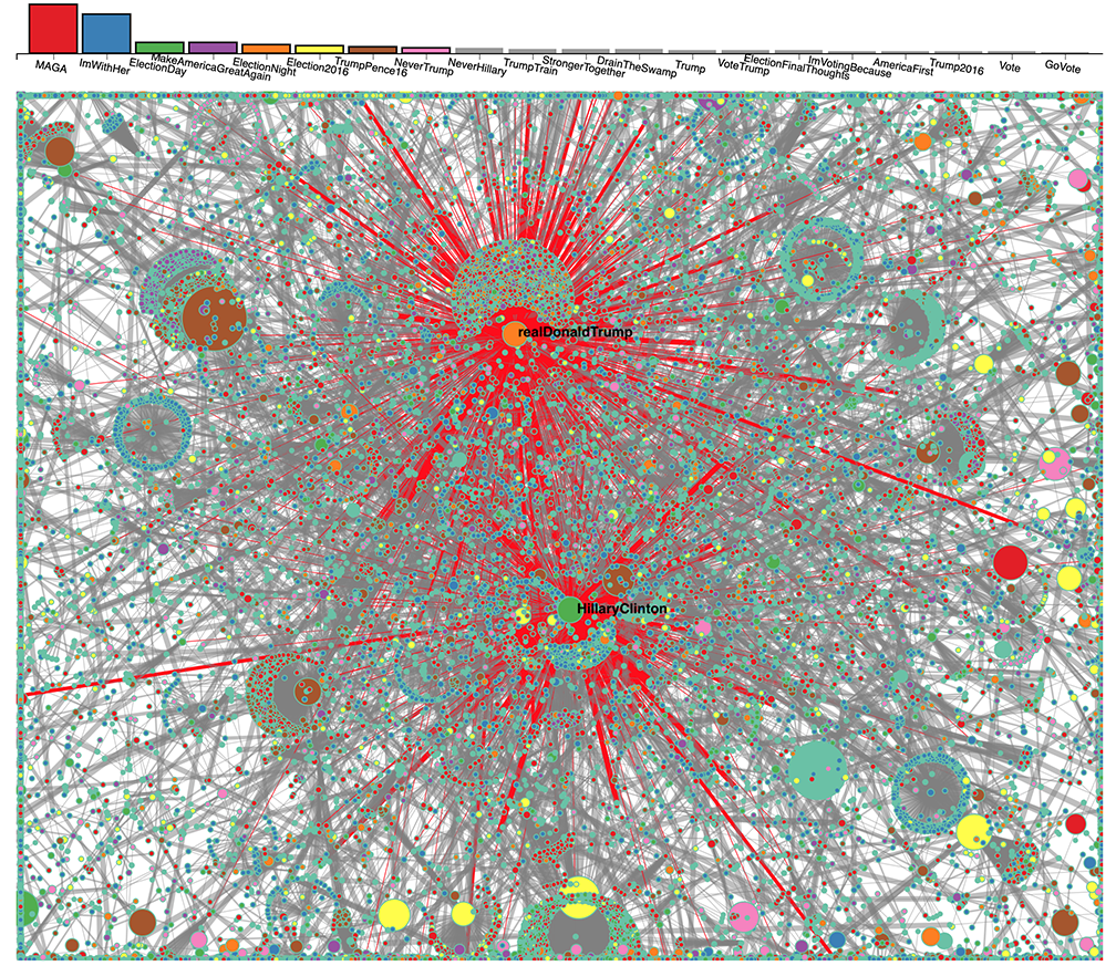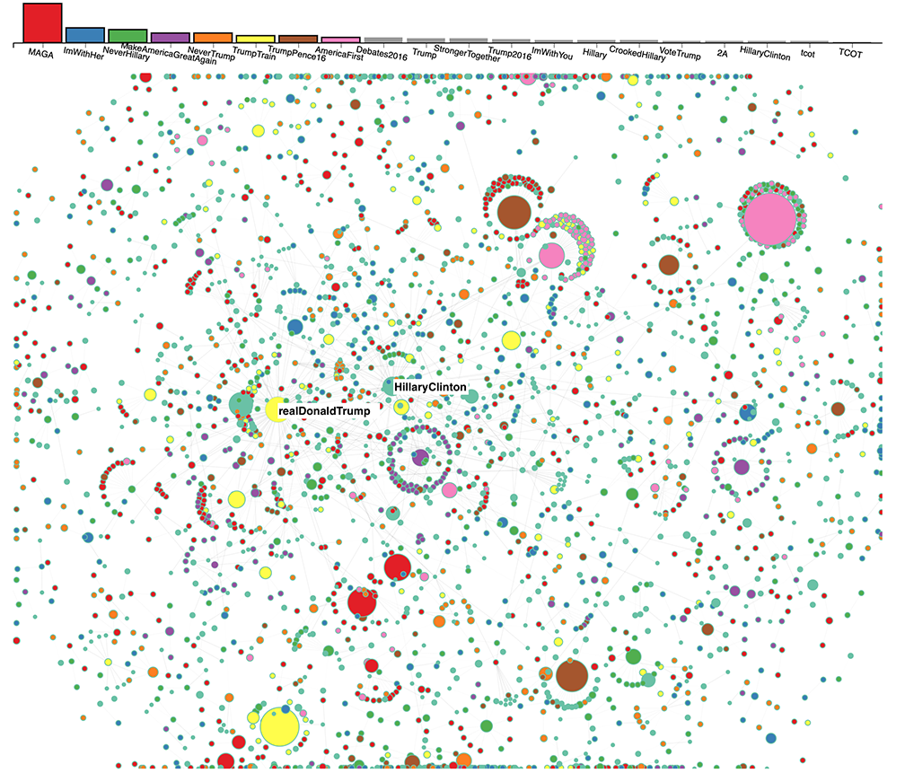In previous chapters we studied social justice networks and affective publics from the bottom up. The interviews in Chapters 4 and 5 provided further insights into how social justice activists engage social media as part of their larger public presentation, as well as specific strategies such as hashtag hijacking. Now, we look at “gaming” the social media networks for political ends. Our case study is the 2016 presidential election in the U.S., where we visualize the structure of Twitter networks from political hashtags across the ideological spectrum (e.g., #MAGA, #ImWithHer, and #FeelTheBern). We look at network structures across the political spectrum and examine how different political strategies might lead to different network structures. Moreover, we look at the extent to which trolls and bots might influence these Twitter networks, as well as the impact that individual Twitter posters had during critical moments of the campaign, especially during the presidential debates between candidates Donald Trump and Hillary Clinton. A related purpose of this set of data visualizations of Twitter activity is to measure the relative popularity of tweets from Russian-based trolls and bots compared to those made by the candidates, celebrities, and other social media influencers. For instance, a Pew Research Center study predicted that it is bots that post about two-thirds of tweeted links to popular websites, rather than humans.1