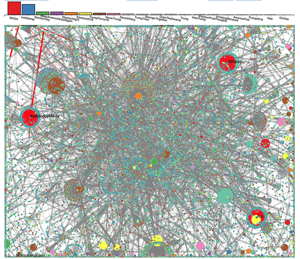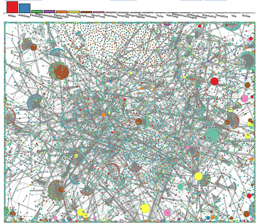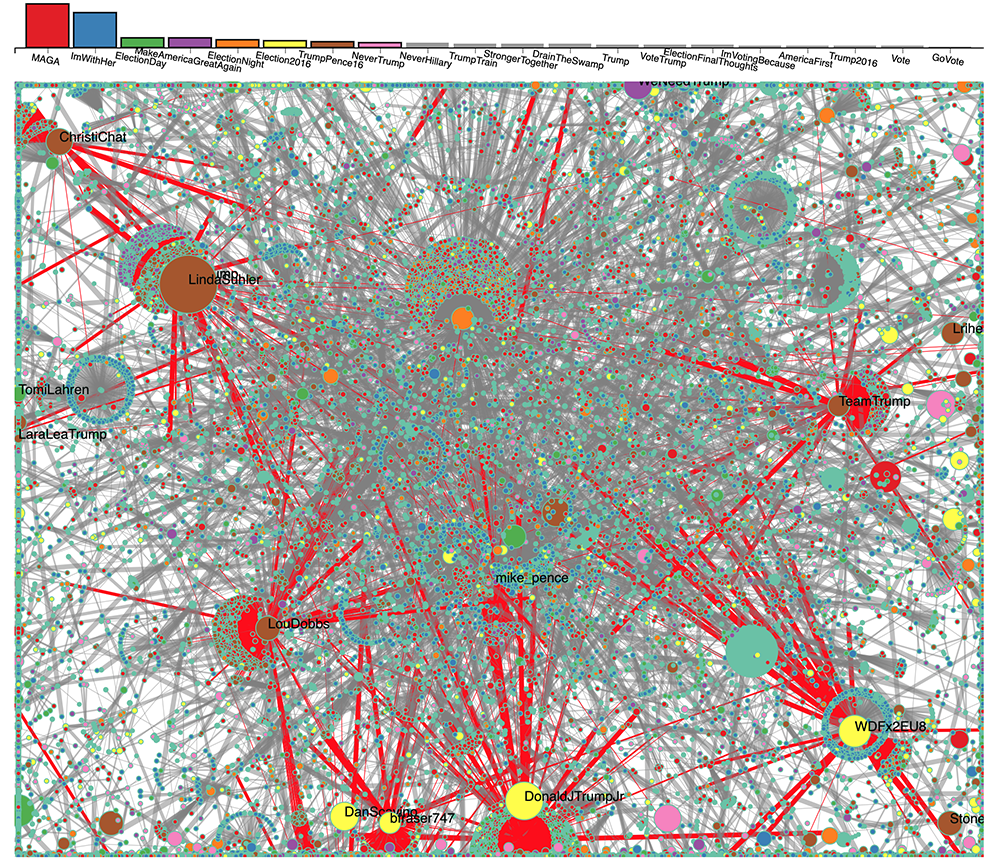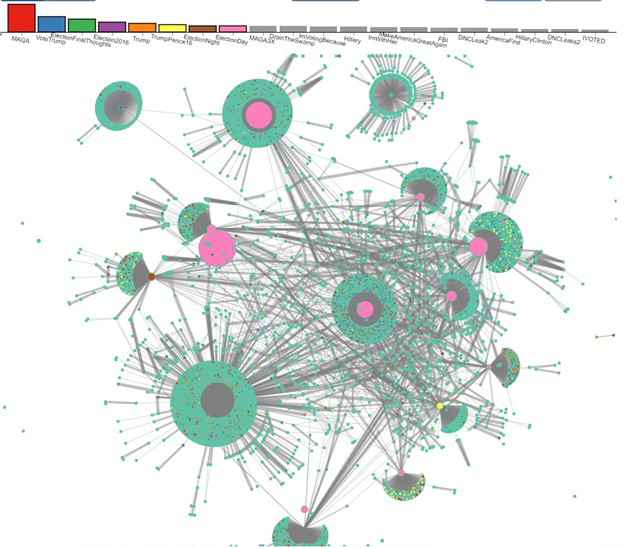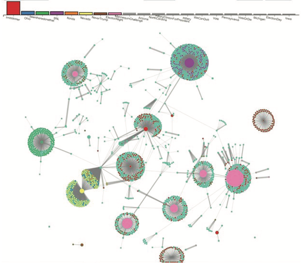In previous chapters we studied social justice networks and affective publics from the bottom up. The interviews in Chapters 4 and 5 provided further insights into how social justice activists engage social media as part of their larger public presentation, as well as specific strategies such as hashtag hijacking. Now, we look at “gaming” the social media networks for political ends. Our case study is the 2016 presidential election in the U.S., where we visualize the structure of Twitter networks from political hashtags across the ideological spectrum (e.g., #MAGA, #ImWithHer, and #FeelTheBern). We look at network structures across the political spectrum and examine how different political strategies might lead to different network structures. Moreover, we look at the extent to which trolls and bots might influence these Twitter networks, as well as the impact that individual Twitter posters had during critical moments of the campaign, especially during the presidential debates between candidates Donald Trump and Hillary Clinton. A related purpose of this set of data visualizations of Twitter activity is to measure the relative popularity of tweets from Russian-based trolls and bots compared to those made by the candidates, celebrities, and other social media influencers. For instance, a Pew Research Center study predicted that it is bots that post about two-thirds of tweeted links to popular websites, rather than humans.1