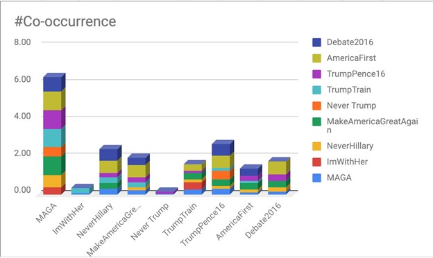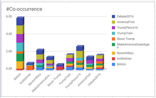 Figure 6.19 highlights the comparisons between co-occurrence from the left and the right. As the bar graph shows, Trump supporters, or those representing the right, are more likely to layer their hashtags. For instance, in Figure 6.19 the term MAGA ranks highest in terms of co-occurrence. Each color represents a hashtag paired with each one of the other hashtags. The amount of color visible among representations of each hashtag signifies the percentage of co-occurrence between these two hashtags. For instance, #MAGA is sixth in comparison to other right-supporting / Trump-supporting hashtags, such as #NeverHillary and #MakeAmericaGreatAgain; the left-supporting hashtags, #ImWithHer and #NeverTrump, experience very little co-occurrence. Additionally, #NeverTrump is accompanied by only Trump-supportive hashtags #MAGA and #TrumpPence16. Most notably, #MAGA is the most popular of the hashtags and is paired with the most other hashtags, including neutral ones like #Debate2016, and has a multiplier effect by using combinations of hashtags for one tweet.