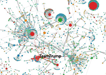 If you look at the network that surrounds Hillary Clinton’s account, the pro-Trump subnetworks have overwhelmed that landscape too. While Trump’s Twitter account has all of these subnetworks budding off of him, not all of them are leading back to him. Rather, the pro-Trump subnetworks appear to have their own center of gravity, and have even co-opted opposing hashtags, such as “#ImWithHer”. In summary, the pro-Trump dominance on Twitter is multi-tiered and even legacy media outlets are neutralized in their scope.
